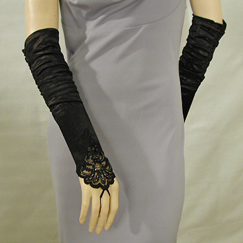 Embroidered Satin Fingerless Gloves Long satin fingerless gloves with openwork embroidery, beads and sequins. These gloves are shirred above the elbow and the embellishment is on the hand. The small pearl beads match the color of the gloves and the sequins are faceted and clear. With 10% Lycra and elastic shirring one size fits most. Item G189BK Price $11.95 Measurements: length 11-13" Color: black, Hue: black ![]() |