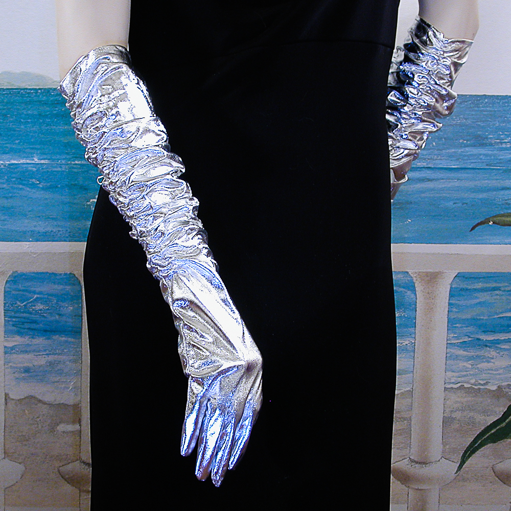 Shirred Elbow Length Metallic Gloves Shirred elbow length shiny metallic gloves. These are fun gloves for costumes or fancy dress parties. They fit a medium to large hand and do not have any stretch. Item G282SL Price $17.95 Measurements: length 14" Color: silver, Hue: silver ![]() |