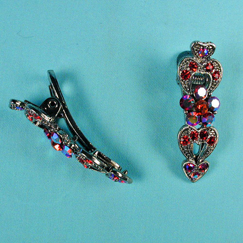 Set Of Two Small Rhinestone Hair Clips Set of two small crystal rhinestone hair clips set in antique look metal. Item H589RD Price $12.95 Measurements: width 1/2", length 1-1/2" Color: red, Hue: cherry ![]() |