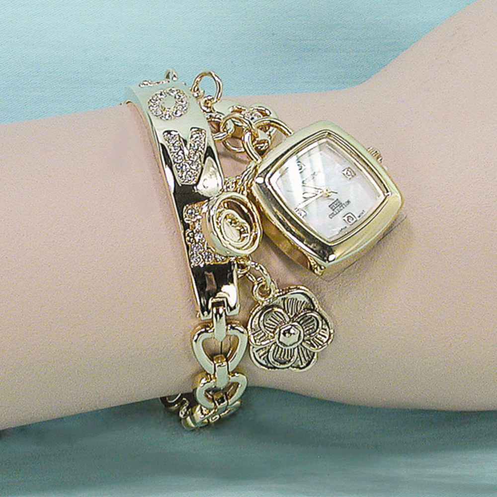 Heart Charm Bracelet Watch With Rhinestone Accents Adorable gold charm bracelet watch. The band is solid in the front with "LOVE" inscribed on the on it with tiny embedded rhinestones. The back of the watch is wide gold chain with heart shaped links. The charms include a two different hearts, a flower, a four leaf clover and the watch. The band has channel clasp and can be sized a half inch smaller. Item J543GD Price $29.95 Measurements: width 3/8-1-3/4", length 8" Color: gold, Hue: gold ![]() |