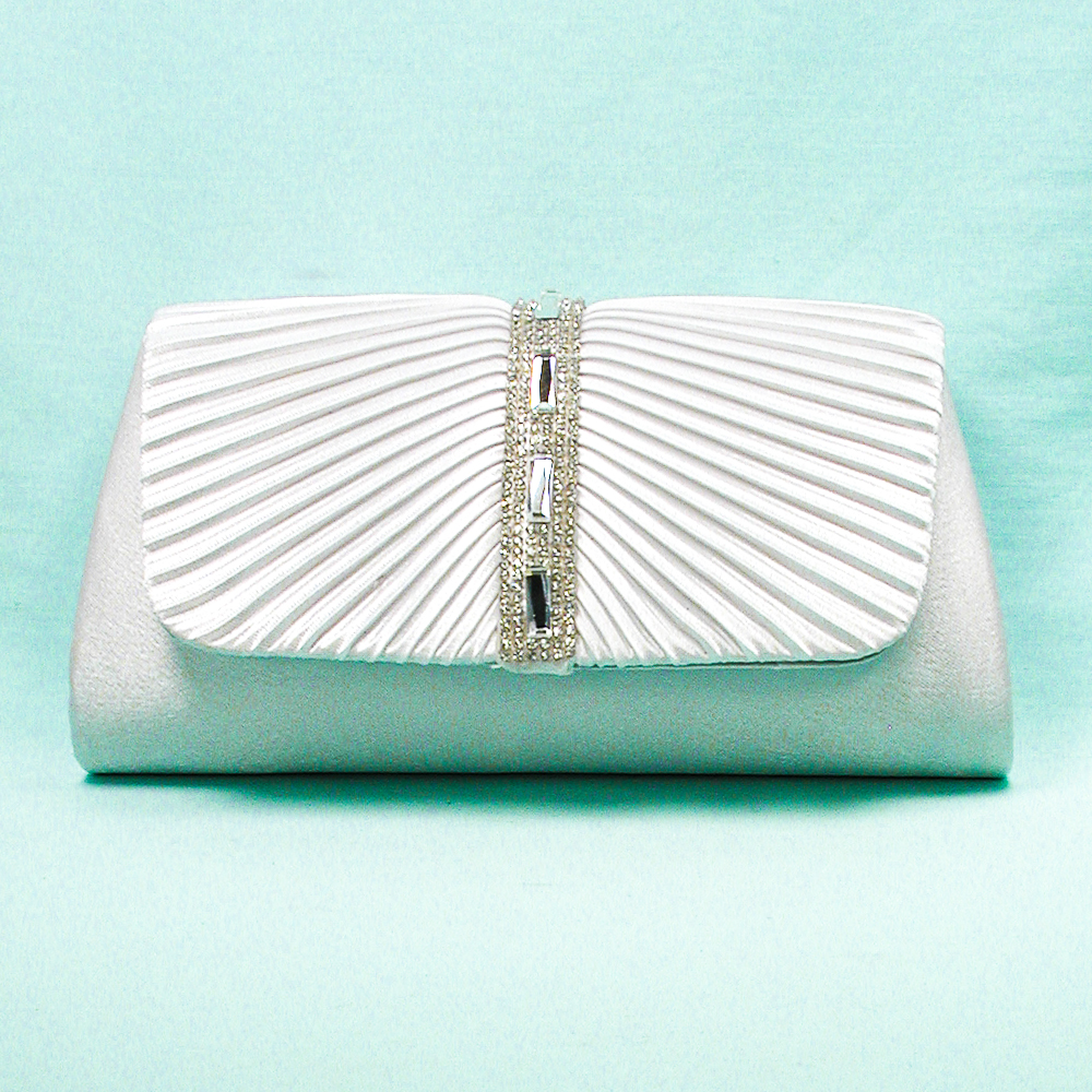 Satin Evening Clutch Bag With Rhinestone Trim Satin clutch bag with crystal rhinestone strip running down the center of the pleated flap. The rhinestones are designed in a background of small ones with rectangle cushion cut ones in between. It has a snap clasp, satin lining and and includes matching shoulder cord. In white, the evening bag is ideal for weddings and proms. Item P126SIWH Price $34.95 Measurements: width 8", height 4", depth 1-3/4" Color: white, Hue: white ![]() |
