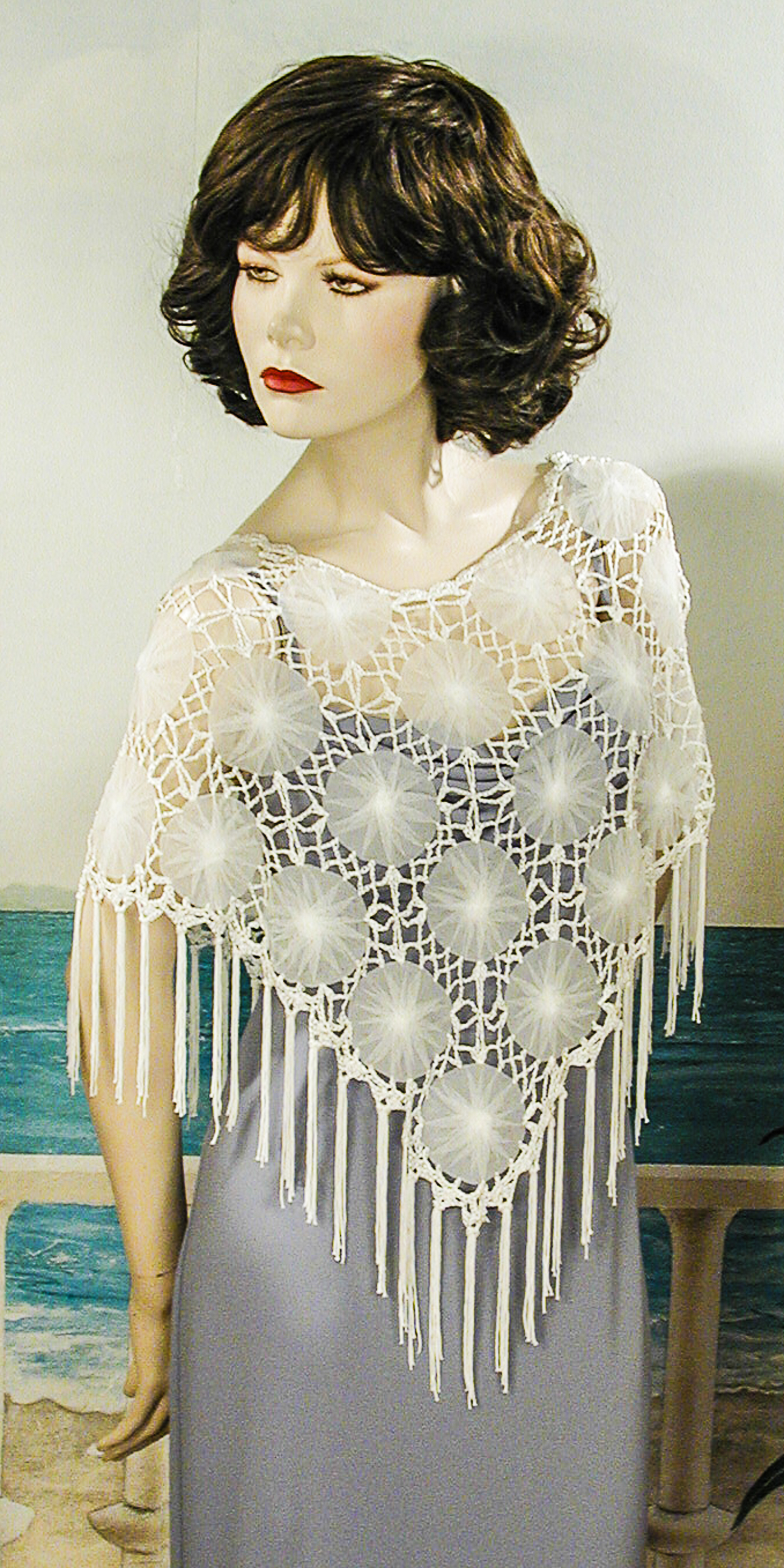 Large brown velvet poncho with a floral design and knotted fringed edge. This is an luxurious wrap with large lavender flowers, butterflies and scrolling around the hem. The scrolled design, border and fringe are a light dove gray. The fiber content is 65% silk and 35% rayon. You will stay warm and look fabulous in this beautiful wrap. It is appropriate for evenings wear and daytime social events.