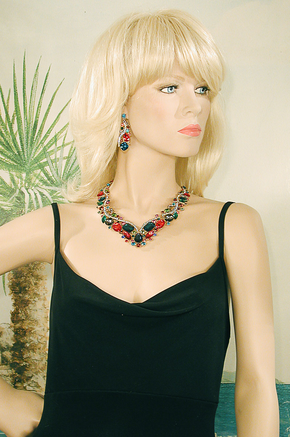 Multi Hue Large Crytal Rhinestone Bib Necklace & Earrings Set