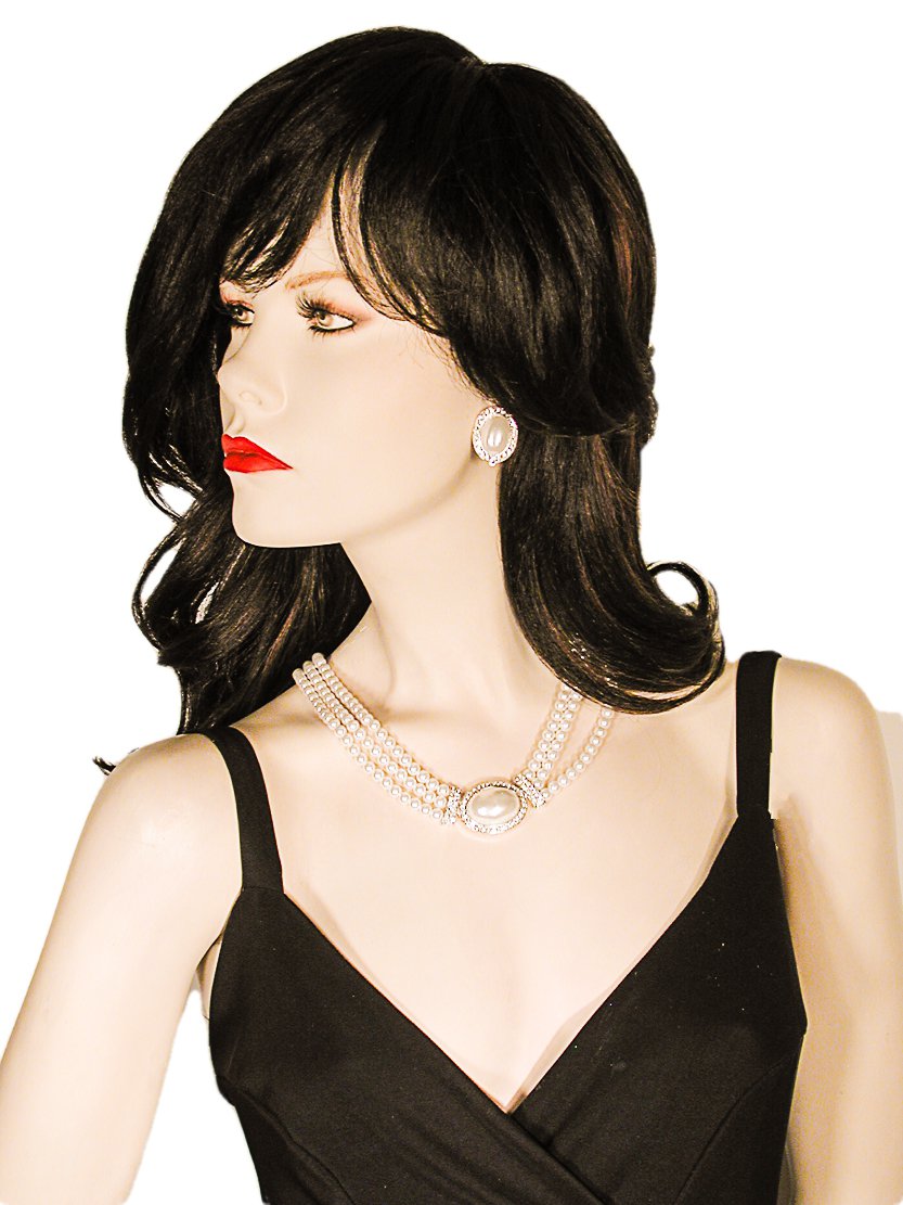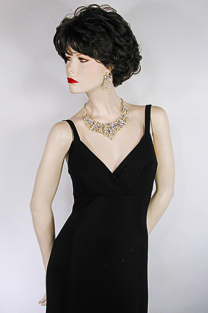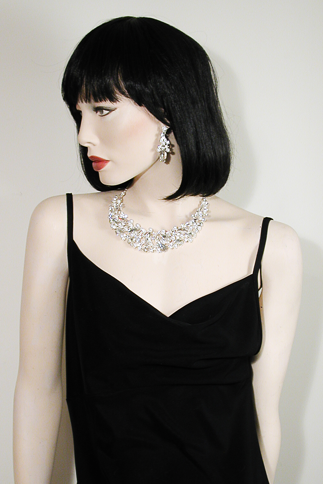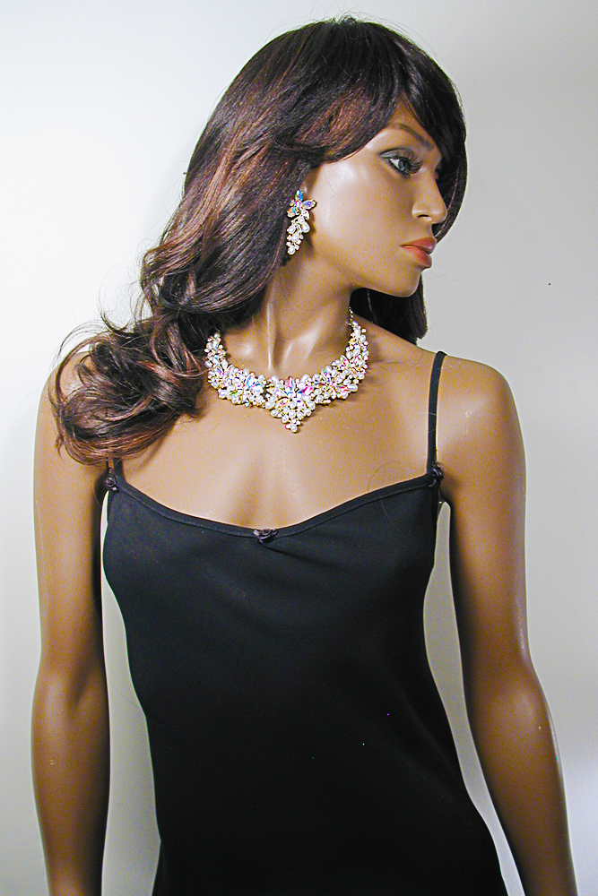 Sensational large crystal rhinestone bib necklace and earring set. These beautiful necklaces feature large marquise, pear and round stones. The colored stones are iridescent and reflect several colors depending on the angle of the light. They comes in several colors: royal with purple highlights, turquoise with blue highlights, teal with blue highlights, purple with blue highlights, peach with lavender highlights, multi colored, clear and black. They are fashioned in an open work design with a large drop pear stone in the center. They are made with segments which move with you but lay flat. The matching earrings are designed with the same stones.